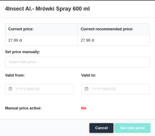 In this window, set the new price and the date when the new offer should take effect. Confirm the changes by clicking the "Set New Price" button.