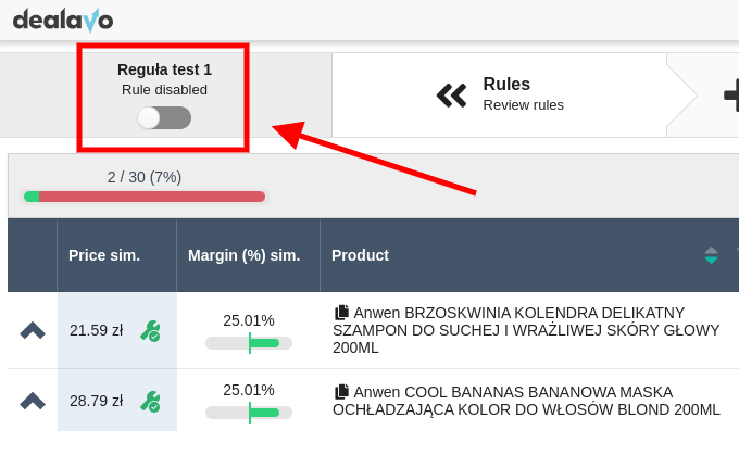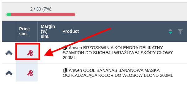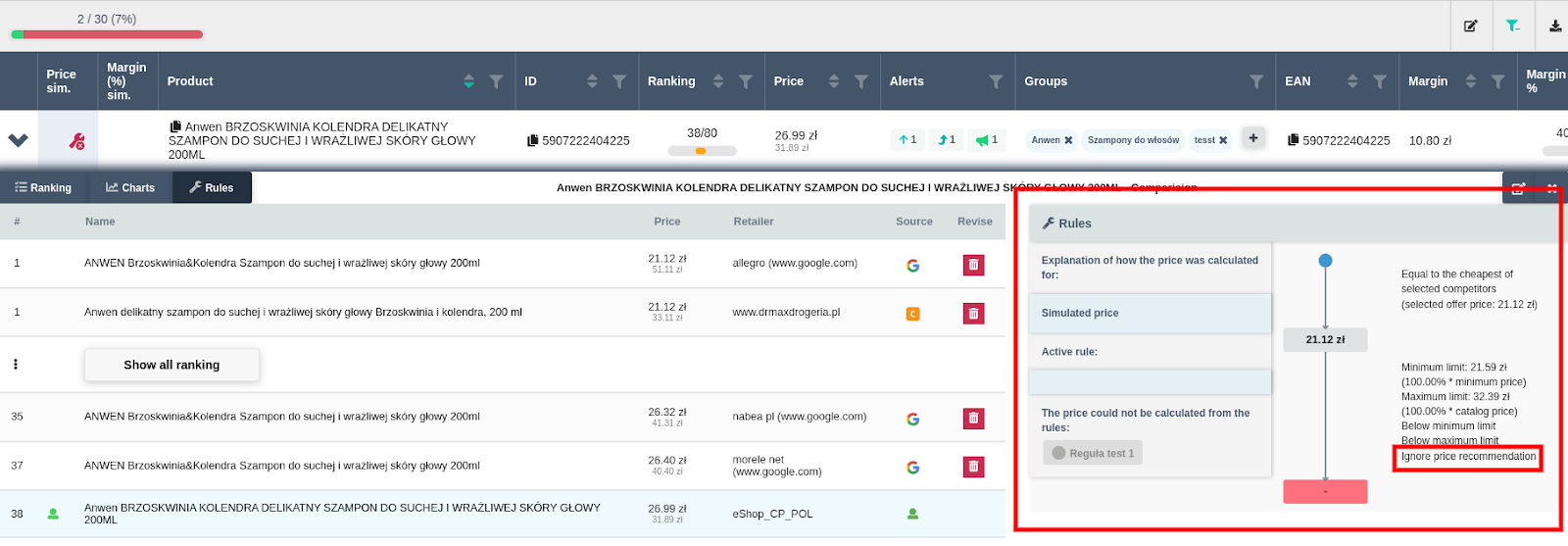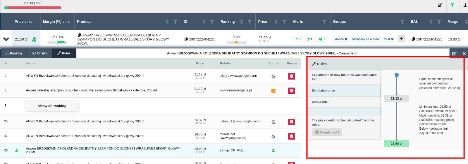 After saving the rule settings, proceed to the final step: the price simulation. This view will display a list of recommended price changes and information about the simulated margin based on your previously set rule parameters. Additional information about the products included in the rule will also be available.