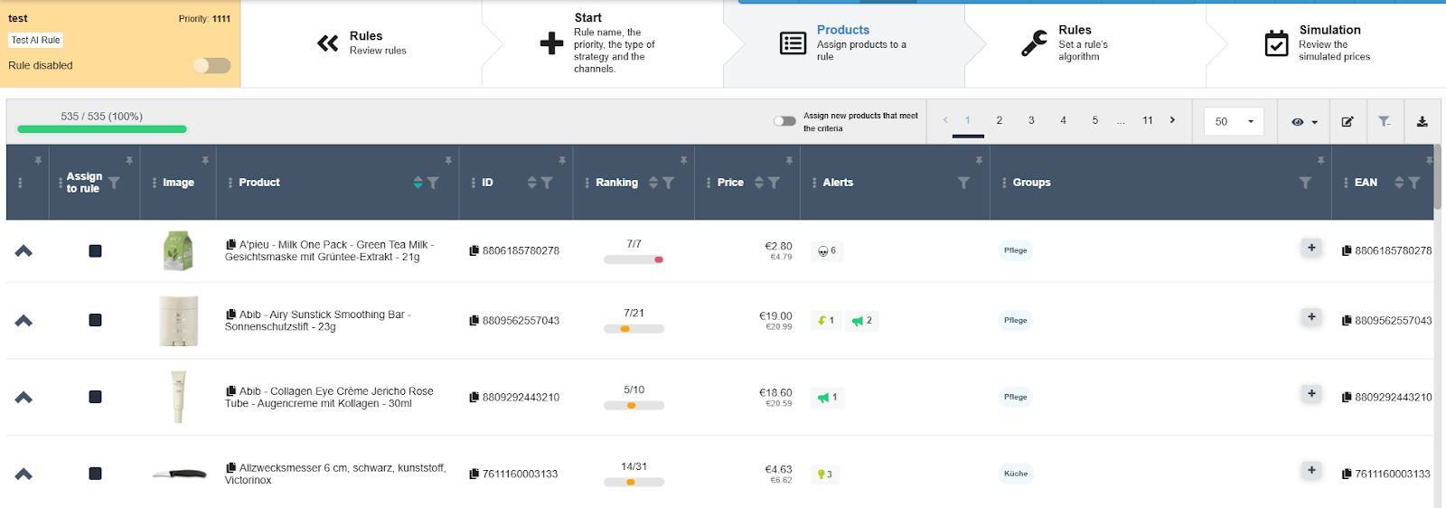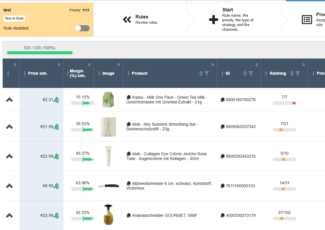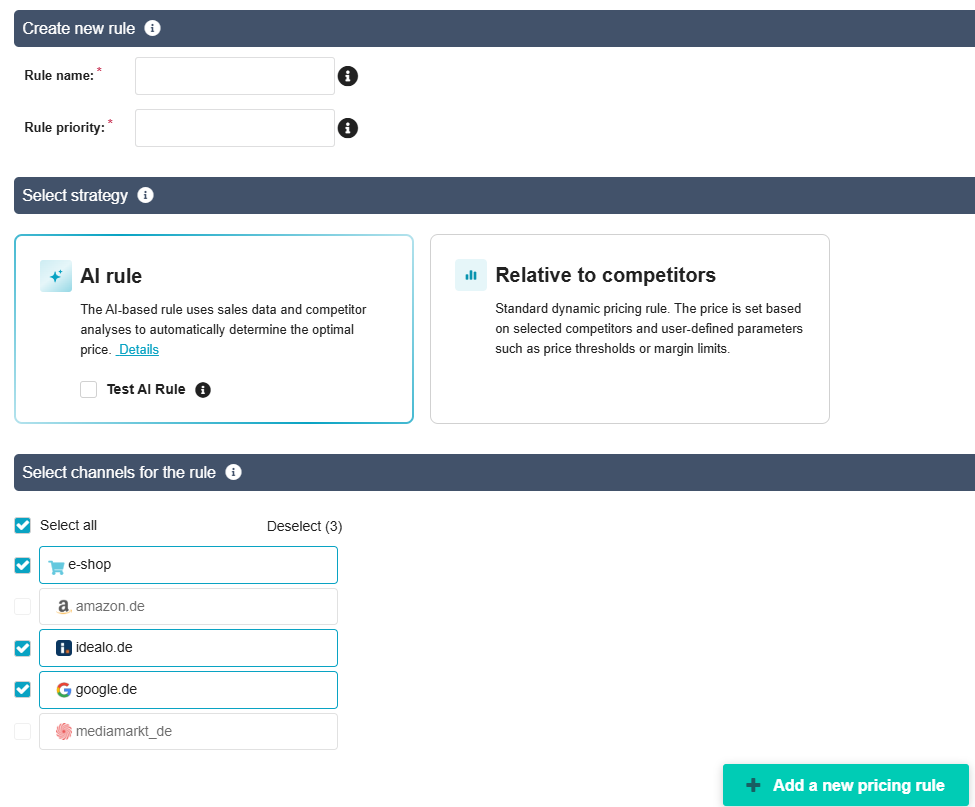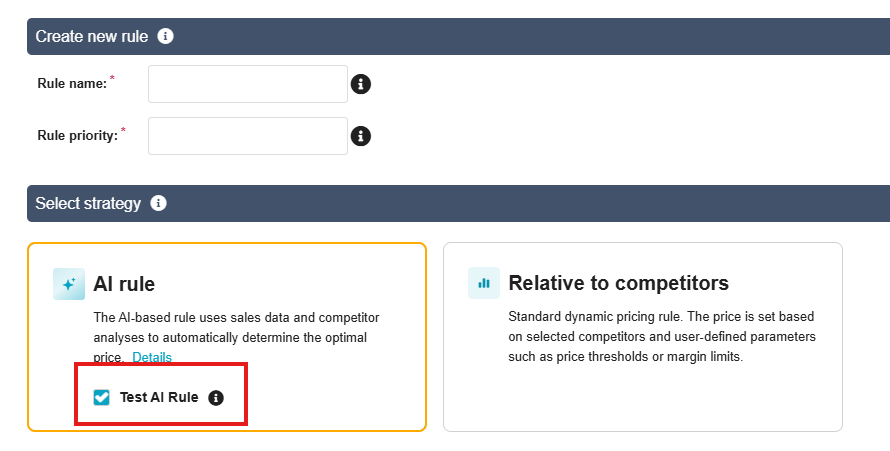 Repricing AI is an additional strategy available in the Repricing module. You can create multiple AI rules, assign products, and set price limits - the algorithm then handles the rest automatically without further user action.