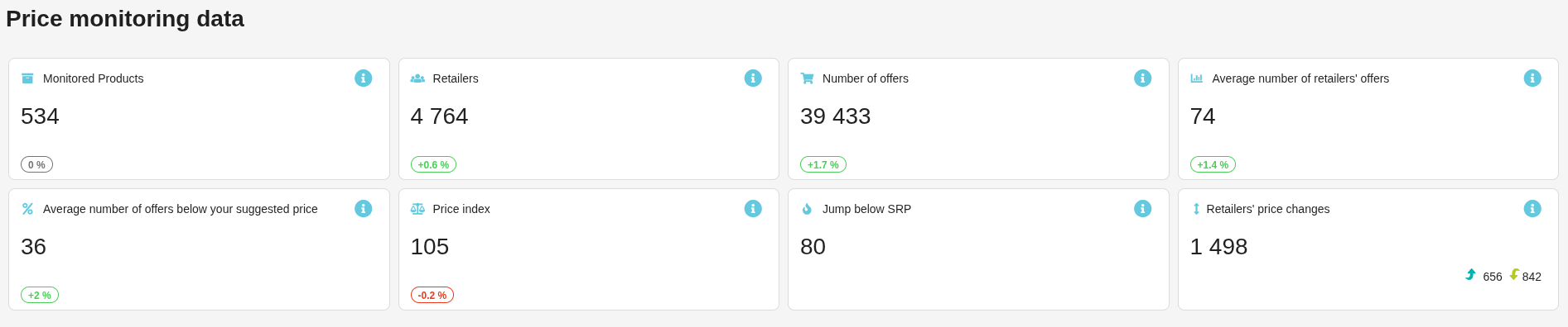 1. Monitorowane produkty – liczba aktualnie monitorowanych produktów. Liczone są tylko te produkty, dla których w rankingu istnieje co najmniej jedna dostępna oferta z ceną.