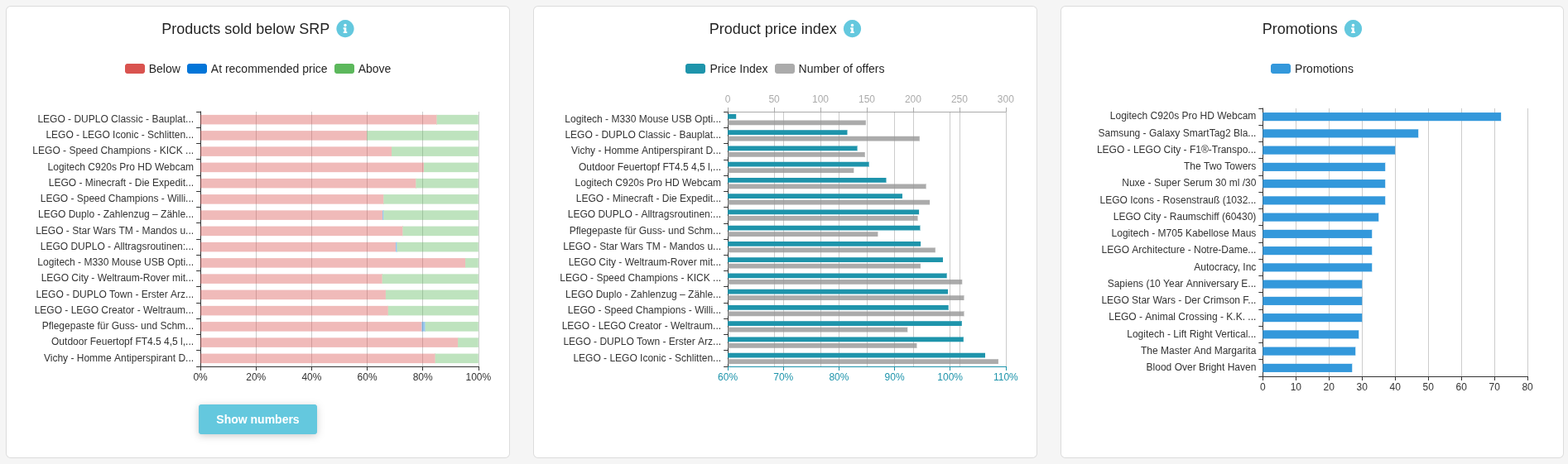 Pokazuje, które produkty są najczęściej sprzedawane poniżej ceny sugerowanej (SRP). W odróżnieniu od wykresu Sprzedawane powyżej / poniżej SRP, tu podział dotyczy produktów, a nie sprzedawców.