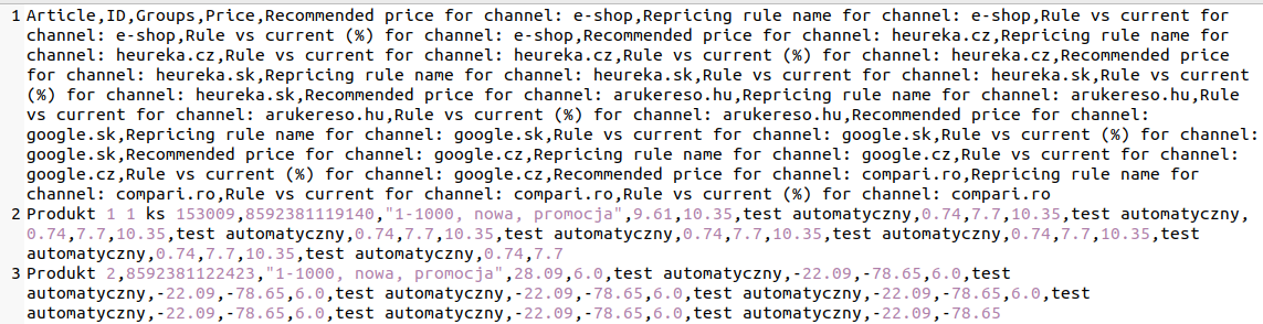 W plikach znajdują się rekomendowane ceny per produkt i per każdy kanał monitorowany przez klienta, dla którego zdefiniowano cenę w repricingu. Waluta pliku jest zgodna z walutą konta.