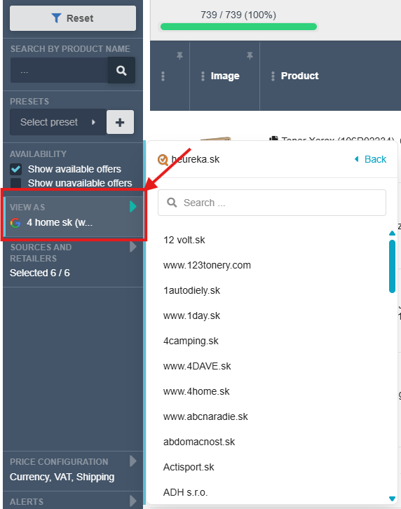 Po zmianie perspektywy widok w zakładkach Produkty i Retailers zostaje automatycznie przeliczony tak, jakbyś była sklepem wybranym w panelu.